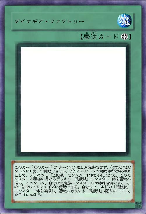 このカード名のカードは1ターンに1度しか発動できず、②の効果は1ターンに1度しか発動できない。①:このカードの発動時の効果処理として、デッキから「恐獣装」モンスター1体を手札に加え、そのモンスターと種族の異なるデッキの「恐獣装」モンスター1体を墓地へ送る。このターン、自分は恐竜族モンスターしか特殊召喚できない。②:自分メインフェイズに発動できる。自分フィールドの「恐獣装」モンスター1体を破壊し、墓地に存在する「恐獣装」魔法カード1枚を手札に加える。 |