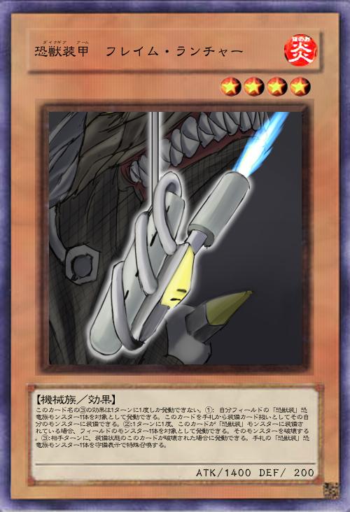 このカード名の②の効果は1ターンに1度しか発動できない。①:自分フィールドの「恐獣装」モンスターを融合素材とし、「恐獣装」恐竜族モンスター1体を融合召喚する。自分フィールドにレベル8以上のモンスターが存在しない場合、墓地の「恐獣装」モンスターを融合素材としてデッキに戻すこともできる。②:フィールドのモンスターが効果で破壊された場合、墓地のこのカードを除外し、自分フィールドの「恐獣装」モンスターカード1枚を対象として発動できる。そのカードを破壊する。 |