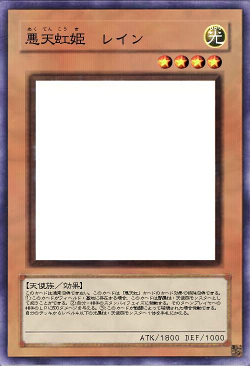 【天使族/特殊召喚/効果】 このカードは通常召喚できない。このカードは「悪天虹」カードのカード効果でのみ特殊召喚できる。①:このカードがフィールド・墓地に存在する場合、このカードは闇属性・悪魔族モンスターとして扱うことができる。②:自分・相手のスタンバイフェイズに発動する。そのターンプレイヤーの相手のLPに800ダメージを与える。③:このカードが戦闘によって破壊された場合発動できる。自分のデッキからレベル4以下の光属性・天使族モンスター1体を手札に加える。 |