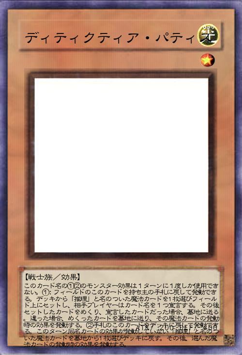 【戦士族/効果】 このカード名の①②のモンスター効果は1ターンに1度しか使用できない。①:フィールドのこのカードを持ち主の手札に戻して発動できる。デッキから「推理」と名のついた魔法カードを1枚選びフィールド上にセットし、相手プレイヤーはカード名を1つ宣言する。その後セットしたカードをめくり、宣言したカードだった場合、墓地に送る。違った場合、めくったカードを墓地に送り、その魔法カードの発動時の効果を発動する。②手札のこのカードをデッキに戻して発動できる。このターン同名カードの効果が発動していない「推理」と名のついた魔法カードを墓地から1枚選びデッキに戻す。その後、選んだ魔法カードの発動時の効果を発動する。 |
