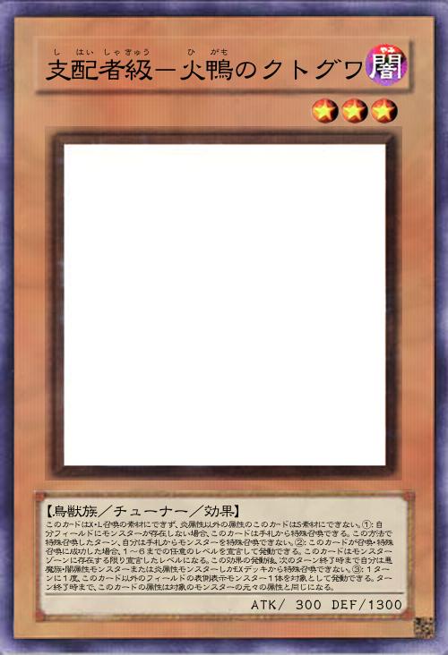 【鳥獣族/チューナー/効果】 このカードはX・L召喚の素材にできず、炎属性以外の属性のこのカードはS素材にできない。①:自分フィールドにモンスターが存在しない場合、このカードは手札から特殊召喚できる。この方法で特殊召喚したターン、自分は手札からモンスターを特殊召喚できない。②:このカードが召喚・特殊召喚に成功した場合、1~6までの任意のレベルを宣言して発動できる。このカードはモンスターゾーンに存在する限り宣言したレベルになる。この効果の発動後、次のターン終了時まで自分は悪魔族・闇属性モンスターまたは炎属性モンスターしかEXデッキから特殊召喚できない。③:1ターンに1度、このカード以外のフィールドの表側表示モンスター1体を対象として発動できる。ターン終了時まで、このカードの属性は対象のモンスターの元々の属性と同じになる。 |