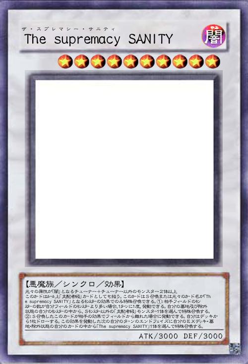 【悪魔族/シンクロ/効果】 元々の属性が「闇」となるチューナー+チューナー以外のモンスター2体以上 このカードはルール上「支配者級」カードとしても扱う。このカードはS召喚または元々のカード名が「The supremacy SANITY」となるモンスターの効果でのみ特殊召喚できる。①:相手フィールドのモンスターの数が自分フィールドのモンスターより多い場合、1ターンに1度、発動できる。自分の墓地及び除外状態の自分のモンスターの中から、Sモンスター以外の「支配者級」モンスター1体を選んで特殊召喚する。②:S召喚したこのカードが相手の効果でフィールドから離れた場合に発動できる。自分はデッキから1枚ドローする。この効果を発動した次の自分のターンのエンドフェイズに自分のEXデッキ・墓地・除外状態の自分のカードの中から「The supremacy SANITY」1体を選んで特殊召喚する。 |