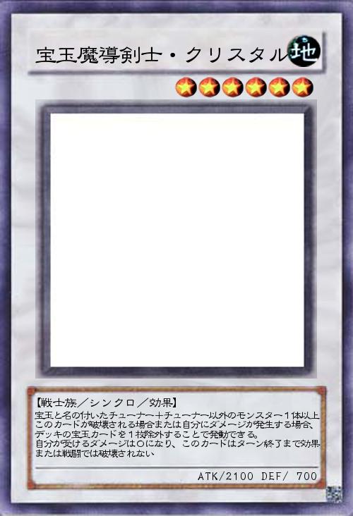 【戦士族/シンクロ/効果】 宝玉と名の付いたチューナー+チューナー以外のモンスター1体以上 このカードが破壊される場合または自分にダメージが発生する場合、デッキの宝玉カードを1枚除外することで発動できる。 自分が受けるダメージは0になり、このカードはターン終了まで効果または戦闘では破壊されない |