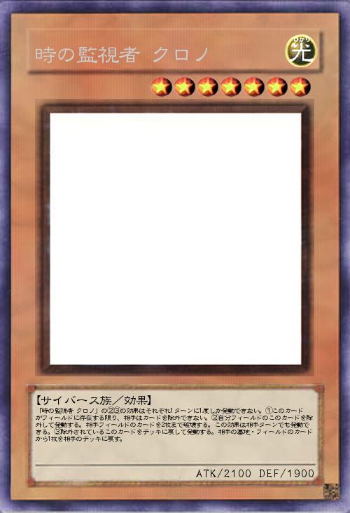 【サイバース族/効果】 「時の監視者 クロノ」の②③の効果はそれぞれ1ターンに1度しか発動できない。①このカードがフィールドに存在する限り、相手はカードを除外できない。②自分フィールドのこのカードを除外して発動する。相手フィールドのカードを2枚まで破壊する。この効果は相手ターンでも発動できる。③除外されているこのカードをデッキに戻して発動する。相手の墓地・フィールドのカードから1枚を相手のデッキに戻す。 |