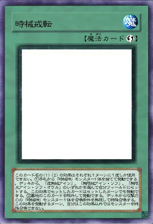 このカード名の(1)(2)の効果はそれぞれ1ターンに1度しか使用できない。①手札から「時械神」モンスター1体を捨てて発動できる。デッキから、「虚無械アイン」、「無限械アイン・ソフ」、「無限光アイン・ソフ・オウル」のいずれかを選んで自分フィールドにセットする。この効果でセットしたカードはセットしたターンでも発動できる。②墓地のこのカードを除外して発動できる。デッキから攻撃力0の「時械神」モンスター1体を召喚条件を無視して特殊召喚する。この効果を発動するターン、自分はこの効果以外ではモンスターを特殊召喚できない。 |