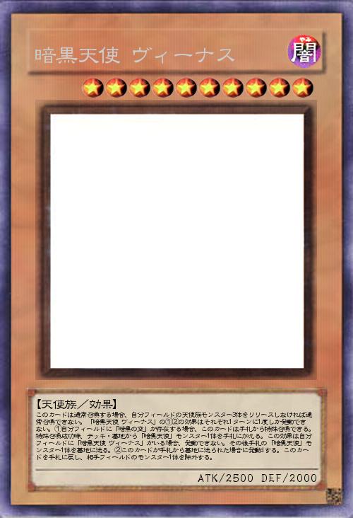 【天使族/効果】 このカードは通常召喚する場合、自分フィールドの天使族モンスター3体をリリースしなければ通常召喚できない。「暗黒天使 ヴィーナス」の①②の効果はそれぞれ1ターンに1度しか発動できない。①自分フィールドに「暗黒の空」が存在する場合、このカードは手札から特殊召喚できる。特殊召喚成功時、デッキ・墓地から「暗黒天使」モンスター1体を手札に加える。この効果は自分フィールドに「暗黒天使 ヴィーナス」がいる場合、発動できない。その後手札の「暗黒天使」モンスター1体を墓地に送る。②このカードが手札から墓地に送られた場合に発動dする。このカードを手札に戻し、相手フィールドのモンスター1体を除外する。 |