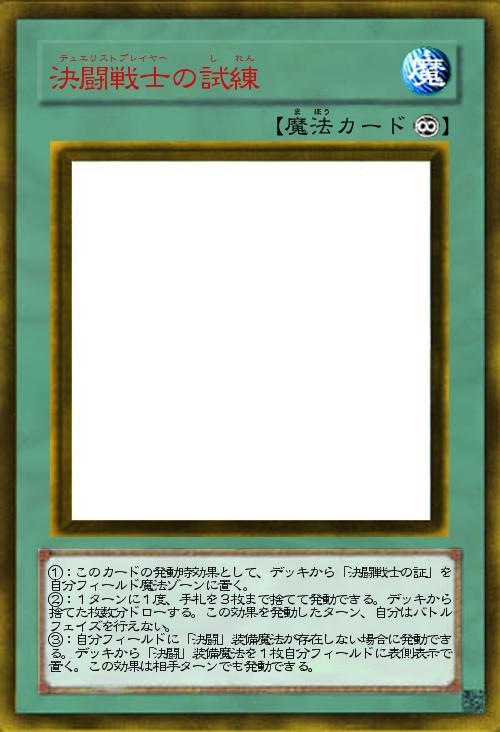 自分プレイヤーに装備可能。このカードは自分フィールドに「決闘戦士の証」が存在する時にカードの発動ができ、そのカードが存在しなくなった時に破壊される。 ①:このカードが装備されたプレイヤーの攻撃力は1500になる。 ②:このカードが装備されたプレイヤーの攻撃力を参照した相手へのダメージが8回与えた時、このカードを破壊する。 ②:相手モンスターの直接攻撃時、自分は守備力でダメージ計算を行う。 |