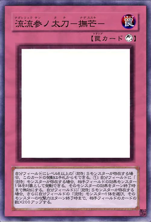 自分フィールドにレベル8以上の「流侍」Sモンスターが存在する場合、このカードの発動は手札からもできる。①:自分フィールドに「流侍」モンスターが存在する場合、相手フィールドの効果モンスター1体を対象として発動できる。そのモンスターの効果をターン終了時まで無効にする。自分フィールドに「流侍」Sモンスターが存在する場合、さらに自分フィールドの「流侍」モンスター1体を選び、そのモンスターの攻撃力はターン終了時まで、相手フィールドのカードの数×200アップする。 |