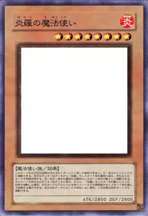 【魔法使い族/効果】 このカード名の①②の効果はそれぞれ1ターンに1度しか使用できない。①:自分メインフェイズに発動できる。自分のデッキ・EXデッキから「炎羅」モンスター1体を墓地へ送り、手札のこのカードを特殊召喚する。②:自分・相手の墓地の炎属性モンスター1体を対象として発動できる。そのカードを持ち主のデッキ・EXデッキに戻す。さらに、「炎羅」モンスターを対象としてこの効果を発動した場合、そのカード以下のレベルを持つフィールドの表側表示モンスター1体を選んで破壊する事ができる。自分のEXデッキにカードが存在しない場合、この効果は相手ターンでも発動できる。 |