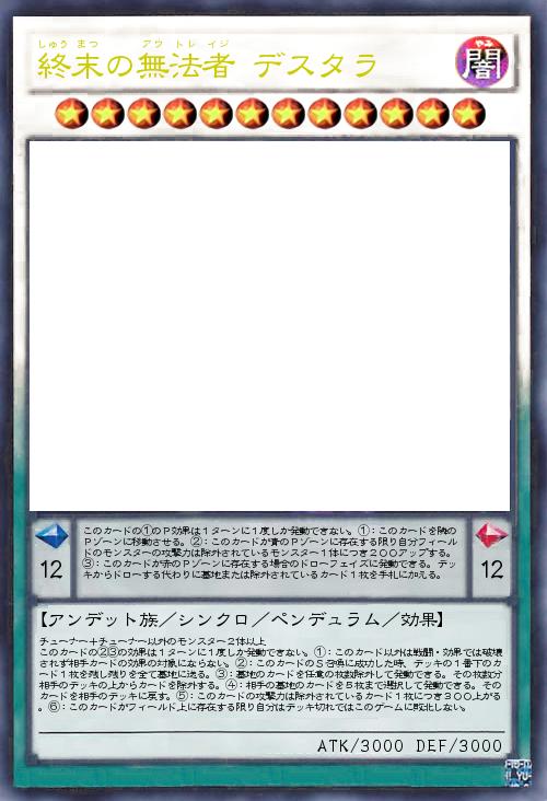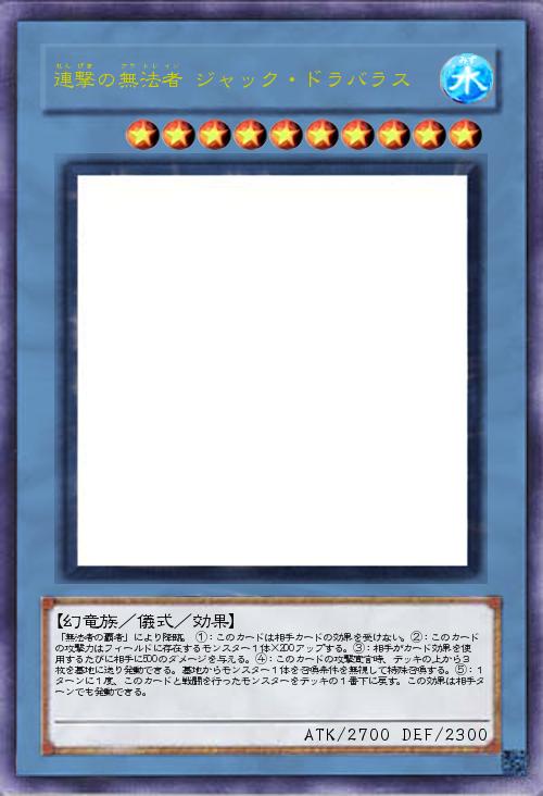 【幻竜族/儀式/効果】 「無法者の覇者」により降臨。 ①:このカードは相手カードの効果を受けない。②:このカードの攻撃力はフィールドに存在するモンスター1体×200アップする。③:相手がカード効果を使用するたびに相手に500のダメージを与える。④:このカードの攻撃宣言時、デッキの上から3枚を墓地に送り発動できる。墓地からモンスター1体を召喚条件を無視して特殊召喚する。⑤:1ターンに1度、このカードと戦闘を行ったモンスターをデッキの1番下に戻す。この効果は相手ターンでも発動できる。 |