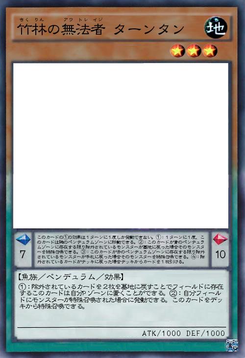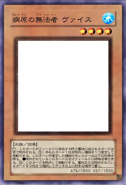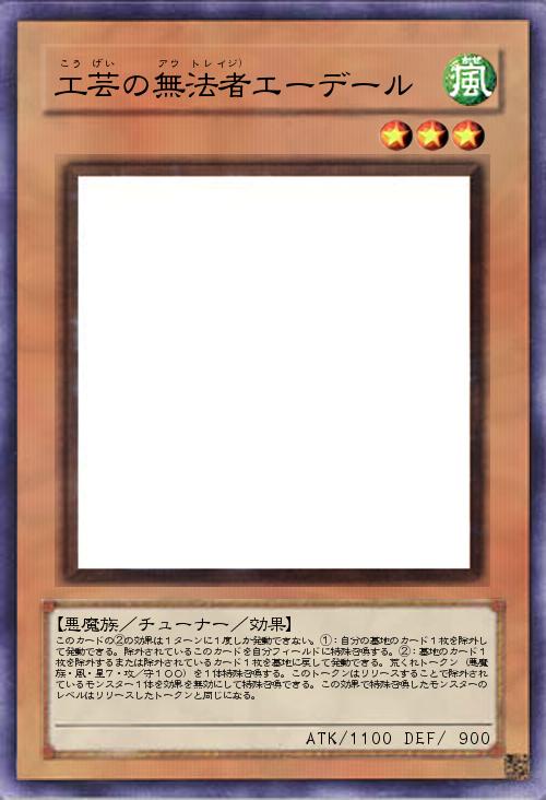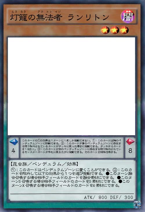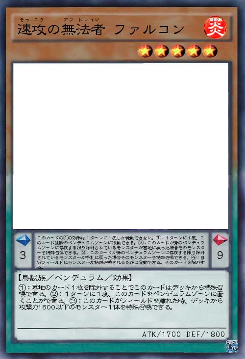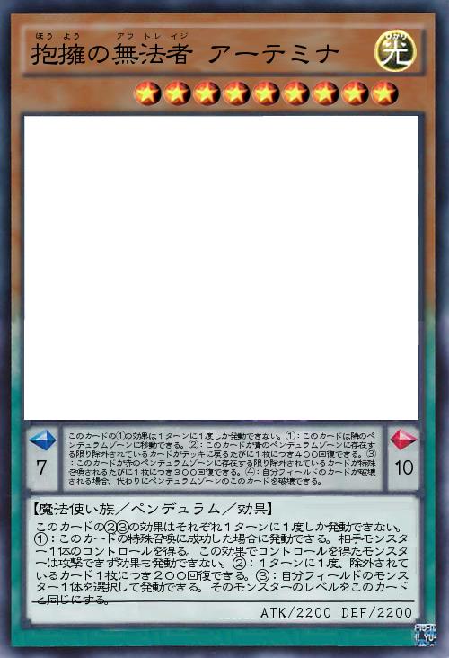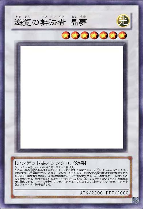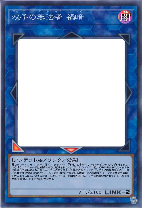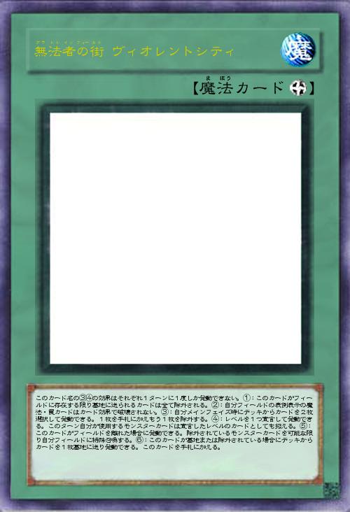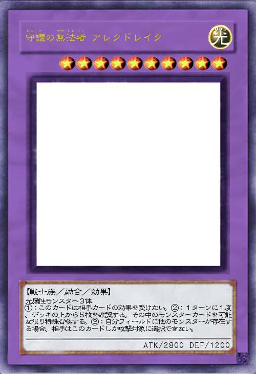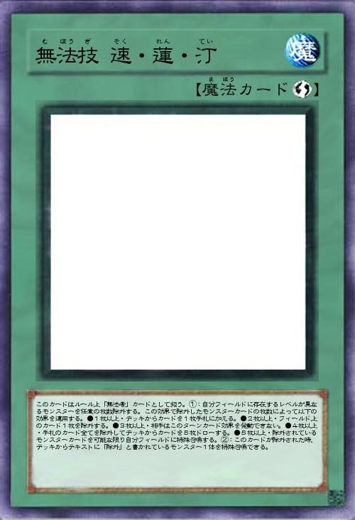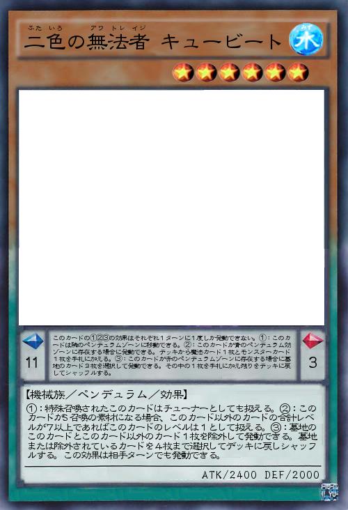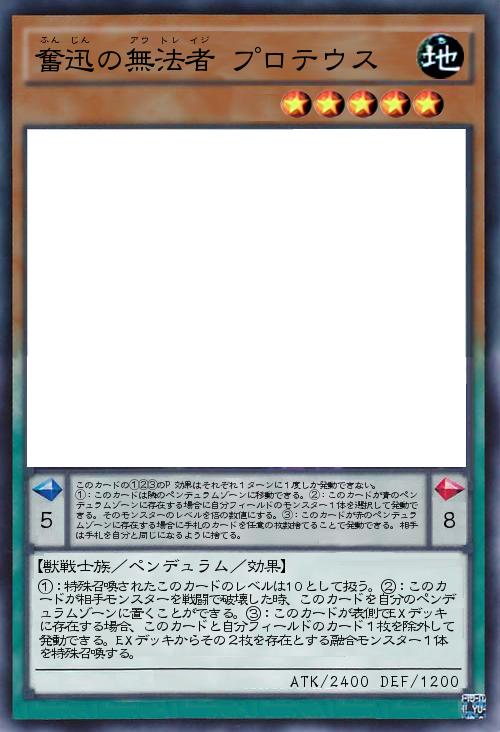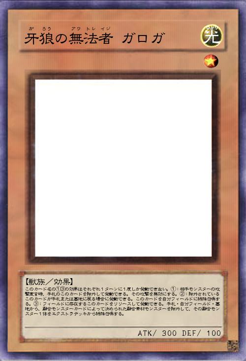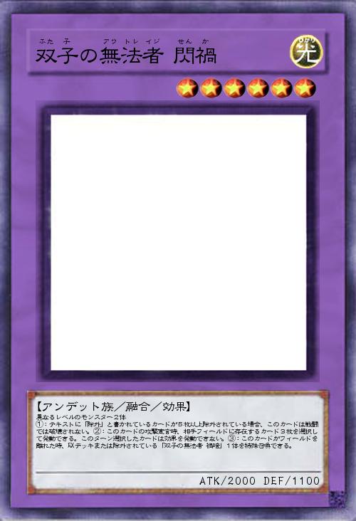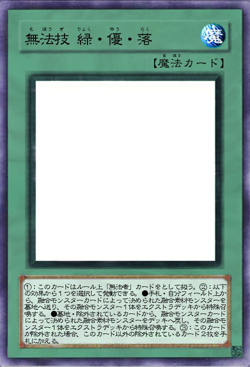 ①:このカードはルール上「無法者」カードをとして扱う。②:以下の効果から1つを選択して発動できる。●手札・自分フィールド上から、融合モンスターカードによって決められた融合素材モンスターを墓地へ送り、その融合モンスター1体をエクストラデッキから特殊召喚する。●墓地・除外されているカードから、融合モンスターカードによって決められた融合素材モンスターをデッキへ戻し、その融合モンスター1体をエクストラデッキから特殊召喚する。③:このカードが除外された場合、このカード以外の除外されているカード2枚を手札に加える。 |