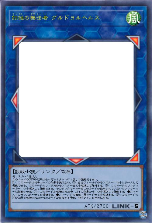 【獣戦士族/リンク/効果】 モンスター4体以上 このカードの②③の効果はそれぞれ1ターンに1度しか発動できない。 ①:このカードは相手カードの効果を受けない。②:自分フィールドのモンスター1体をリリースして発動できる。このカードのリンク先のモンスター全てを破壊して除外する。③:このカードのリンクマーカー1つを選択して発動できる。そのリンクマーカーをこのカードの使用されていないリンクマーカーに移動させる。④:このカードが破壊された時、以下の効果から1つを選択して発動する。●フィールドのモンスター全てを破壊する。●フィールドの魔法・罠カード全てを破壊する。⑤:このカードの④の効果で破壊されなかったカードが存在する場合、相手ライフを半分にする。 |