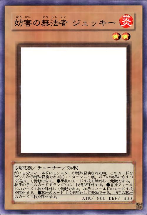 【機械族/効果】 ①:1ターンに1度、次の効果から1つを選んで発動できる。●相手に500のダメージを与える。●相手の手札をランダムに1枚除外する。●相手フィールドのモンスター1体を破壊する。②:このカードが墓地に送られた時、デッキからこのカードよりレベルが高い「無法者」モンスター1体を効果を無効にして特殊召喚できる。 |