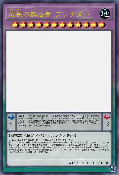 【獣戦士族/ペンデュラム/効果】 ①:特殊召喚されたこのカードのレベルは10として扱う。②:このカードが相手モンスターを戦闘で破壊した時、このカードを自分のペンデュラムゾーンに置くことができる。③:このカードが表側でEXデッキに存在する場合、このカードと自分フィールドのカード1枚を除外して発動できる。EXデッキからその2枚を存在とする融合モンスター1体を特殊召喚する。 このカードの①②③のP効果はそれぞれ1ターンに1度しか発動できない。 ①:このカードは隣のペンデュラムゾーンに移動できる。②:このカードが青のペンデュラムゾーンに存在する場合に自分フィールドのモンスター1体を選択して発動できる。そのモンスターのレベルを倍の数値にする。③:このカードが赤のペンデュラムゾーンに存在する場合に手札のカードを任意の枚数捨てることで発動できる。相手は手札を自分と同じになるように捨てる。 |