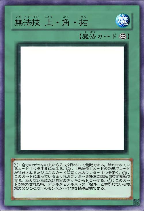 ①:自分のデッキの上から2枚を除外して発動できる。除外されているカード1枚を手札に加える。②:「無法者」カードの効果でカードが除外されるたびにこのカードに荒くれカウンター1つを置く。③:このカードに乗っている荒くれカウンターを任意の数取り除き発動できる。取り除いた数だけ自分のデッキからドローする。④:このカードが除外された時、デッキからテキストに「除外」と書かれている攻撃力2000以下のモンスター1体を特殊召喚できる。 |