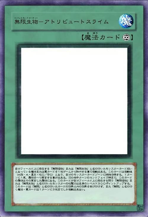 自分フィールド上に存在する「無限怪物」または「無限生物」と名の付いたモンスターカード扱いとなっている魔法または罠カードを1枚ゲームから除外する事で発動出来る。このカードは発動後(水族・水・星8・攻0/守0)となり、自分のモンスターカードゾーンに特殊召喚する。1ターンに1度、属性を一つ宣言する事が出来る。次の相手ターンのエンドフェイズ時まで、このカードの属性はその宣言した属性になる。このカードが自分フィールド上に存在する限り「無限怪物」または「無限生物」と名の付いたモンスターの攻撃力は自身のレベル×300ポイントアップする。このカードは「無限」と名の付いたカードの効果以外の効果を受け付けず、また「無限」と名の付く魔法・罠カードは1ターンに3枚までしか発動出来ない。 |