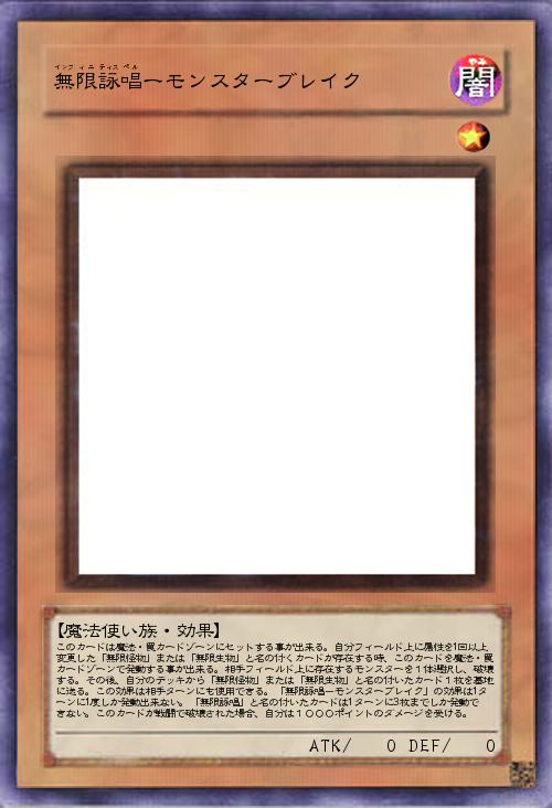 【魔法使い族・効果】 このカードは魔法・罠カードゾーンにセットする事が出来る。自分フィールド上に属性を1回以上変更した「無限怪物」または「無限生物」と名の付くカードが存在する時、このカードを魔法・罠カードゾーンで発動する事が出来る。相手フィールド上に存在するモンスターを1体選択し、破壊する。その後、自分のデッキから「無限怪物」または「無限生物」と名の付いたカード1枚を墓地に送る。この効果は相手ターンにも使用できる。「無限詠唱-モンスターブレイク」の効果は1ターンに1度しか発動出来ない。「無限詠唱」と名の付いたカードは1ターンに3枚までしか発動できない。このカードが戦闘で破壊された場合、自分は1000ポイントのダメージを受ける。 |
