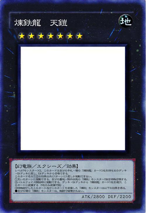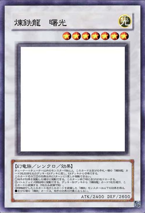 【幻竜族/シンクロ/効果】 チューナー+チューナー以外のモンスター1体以上。このカードは自分の手札・場の「煉鉄龍」カード2枚を持ち主のデッキ・EXデッキに戻し、EXデッキから召喚できる。 このカード名の①②の効果は共に1ターンに1度しか発動できない。 ①相手が効果を発動した場合に発動できる。このターン終了時に自分は1枚ドローする。 ②バトルフェイズ開始時に発動できる。デッキ・EXデッキから「煉鉄龍」カード1枚を選び、このカードに装備する(1枚のみ装備可能)。 ③特殊紹介したこのカード及びこのカードを装備した「煉鉄」モンスターは以下の効果を得る。 ●自分の場の「煉鉄」カードは、相手の効果の対象にならない。 |