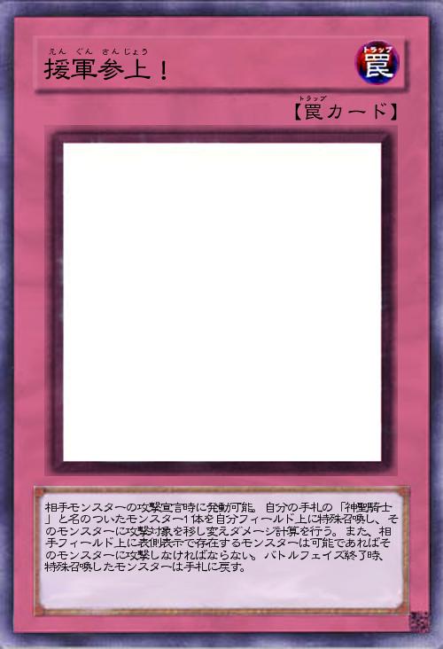 相手モンスターの攻撃宣言時に発動可能。自分の手札の「神聖騎士」と名のついたモンスター1体を自分フィールド上に特殊召喚し、そのモンスターに攻撃対象を移し変えダメージ計算を行う。また、相手フィールド上に表側表示で存在するモンスターは可能であればそのモンスターに攻撃しなければならない。バトルフェイズ終了時、特殊召喚したモンスターは手札に戻す。〇 |