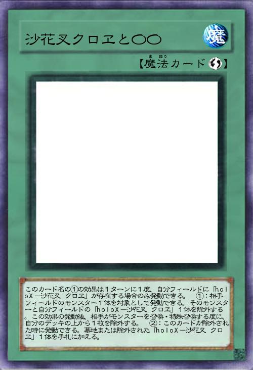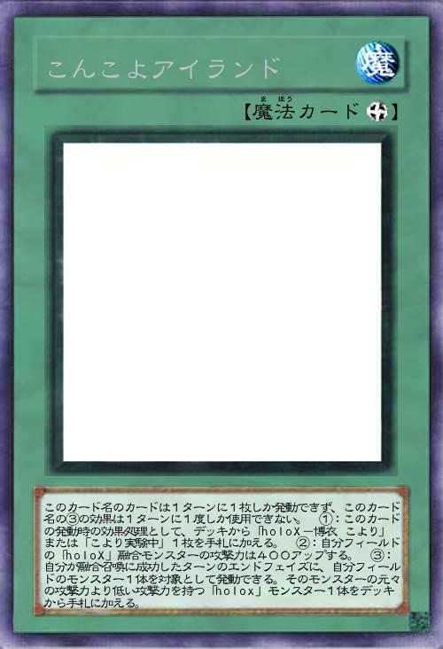 このカード名の①②の効果はそれぞれ1ターンに1度しか使用できない。 ①:自分フィールドに「holoX-風真 いろは」が存在する時に、「holoX-風真 いろは」以外の「holoX」モンスター1体を対象として発動できる。そのモンスターの守備力の半分の数値分LPを回復し、LPを回復した数値分「holoX-風真 いろは」の攻撃力をアップする。 ②:相手ターンに、墓地のこのカードを除外して発動できる。効果テキストに「holoX-風真 いろは」を含む魔法カードを手札から発動できる。 |