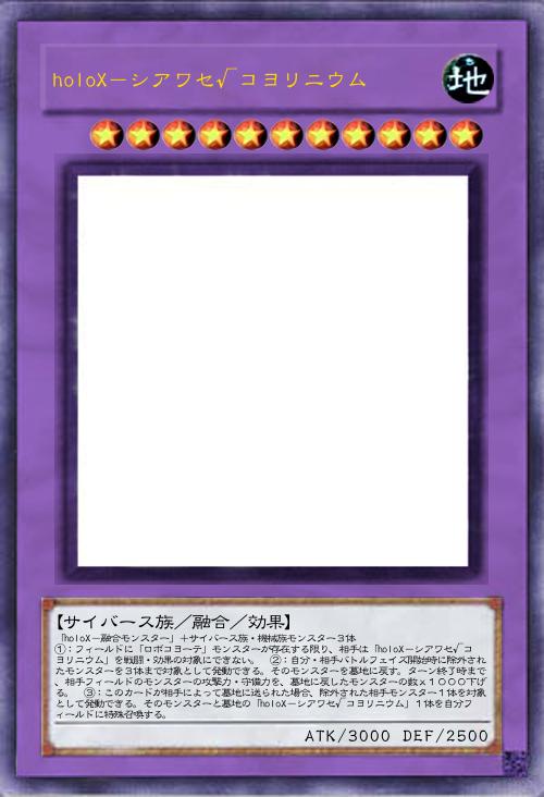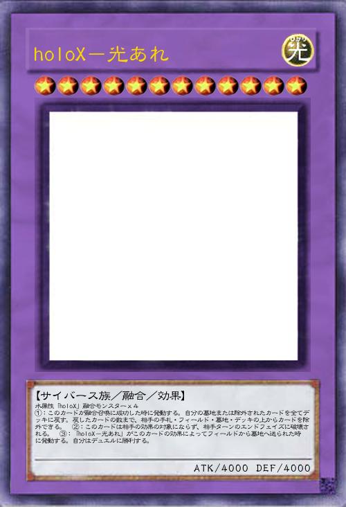 【サイバース族/融合/効果】 EXモンスターゾーンの「holoX-風真 いろは」+守備力1900以上のモンスター2体 このカードは融合召喚及び、自分のフィールドの上記カードを除外した場合のみ特殊召喚できる。 ①:このカードのカード名は、フィールドに存在する限り「holoX-風真 いろは」として扱う。 ②:1ターンに1度、「ござる」カードの効果でLPが回復した場合に発動できる。このカードの攻撃力・守備力は相手ターンの終了時まで回復した数値だけアップする。 ③:自分フィールドに「holoX-ラプラス・ダークネス」が存在する限り、このカードのレベルの上限は20になる。 ④:相手のEXデッキの枚数が5枚以下の場合、1度だけ発動できる。このカードがモンスターを破壊した場合、相手フィールドのカードをすべて手札に戻し、戻したモンスターの攻撃力の合計の数値だけLPにダメージを与える。 |