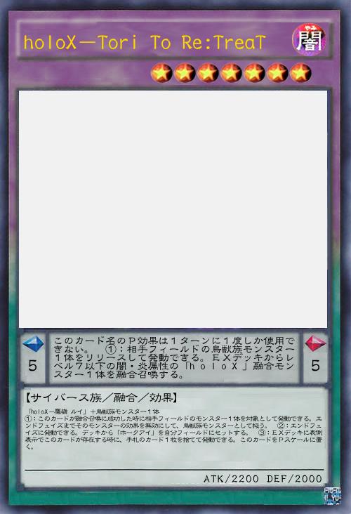 【サイバース族/融合/効果】 レベル10以上の「holoX-風真 いろは」+効果モンスター1体 このカードは融合召喚及び、自分のフィールドの上記カードを除外した場合のみ特殊召喚できる。 ①:このカードのカード名は、フィールドに存在する限り「holoX-風真 いろは」として扱う。 ②:1ターンに1度、このカードのレベルを4つ下げて発動できる。相手フィールドのカード1枚を選んで手札に戻す。この効果は相手ターンでも発動できる。 ③:1ターンに2度まで、相手モンスターがフィールドから離れた場合に発動できる。相手のEXデッキを確認し、その内のモンスター1体を選んで破壊する。 |