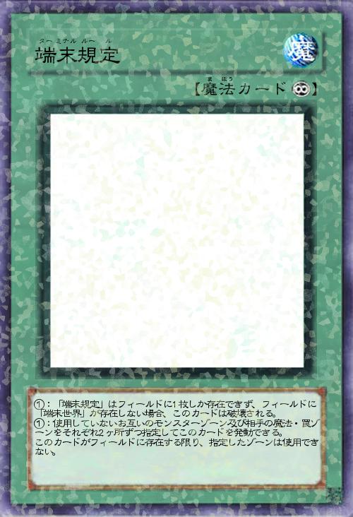 ①:「端末規定」はフィールドに1枚しか存在できず、フィールドに「端末世界」が存在しない場合、このカードは破壊される。〇①:使用していないお互いのモンスターゾーン及び相手の魔法・罠ゾーンをそれぞれ2ヶ所ずつ指定してこのカードを発動できる。〇このカードがフィールドに存在する限り、指定したゾーンは使用できない。 |