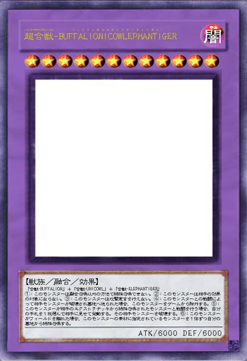 【獣族/融合/効果】 「合獣-BUFFALION」+「合獣-UNICOWL」+「合獣-ELEPHANTIGER」〇①:このモンスターは融合召喚以外の方法で特殊召喚できない。②:このモンスターは相手の効果の対象にならない。③:このモンスターは攻撃宣言を行えない。④:このモンスターとの戦闘によって相手モンスターが破壊され墓地へ送られた場合、このモンスターをゲームから除外する。⑤:このモンスターが相手のエクストラデッキから特殊召喚されたモンスターと戦闘を行う場合、自分の手札を1枚選んで相手に見せて発動する。その相手モンスターを破壊する。⑥:このモンスターがフィールドを離れた場合、このモンスターの素材に指定されているモンスターを1体ずつ自分の墓地から特殊召喚する。 |