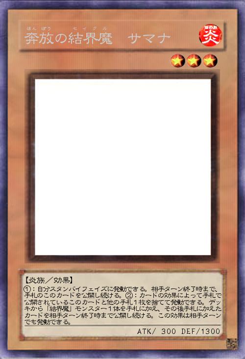 【炎族/効果】 ①:自分スタンバイフェイズに発動できる。相手ターン終了時まで、手札のこのカードを公開し続ける。②:カードの効果によって手札で公開されているこのカードと他の手札1枚を捨てて発動できる。デッキから「結界魔」モンスター1体を手札に加え、その後手札に加えたカードを相手ターン終了時まで公開し続ける。この効果は相手ターンでも発動できる。 |