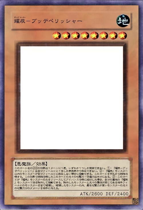【悪魔族/効果】 このカード名の②③の効果は1ターンに1度、いずれか1つしか使用できない。①:「耀辰-ブッデペリッシャー」は自分フィールドに1体しか表側表示で存在できない。②:「耀辰」モンスター以外のモンスターが自分フィールドに存在しない場合に発動できる。このカードを手札から特殊召喚する。この効果で特殊召喚したこのカードの元々の攻撃力・守備力は半分になる。③:このカードが「耀辰」モンスターのみをリリースしてアドバンス召喚に成功した場合、自分の墓地の「耀辰」モンスター1体を除外して発動できる。除外したモンスターと元々の属性が同じである相手フィールドのモンスターを全て破壊し、破壊したモンスターの内、最も攻撃力が高いモンスターの元々の攻撃力分のダメージを相手に与える。 |