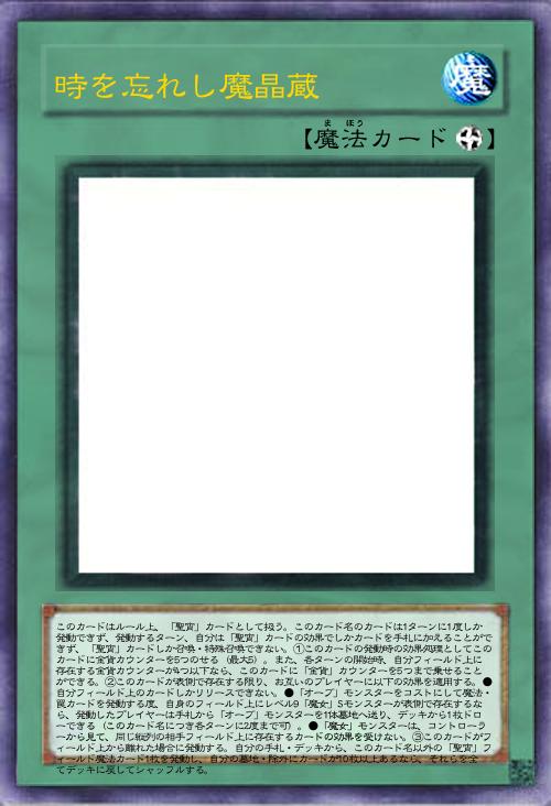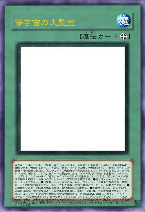 このカードはルール上、「聖宵」カードとして扱う。このカード名のカードは1ターンに1度しか発動できず、発動するターン、自分は「聖宵」カードの効果しか発動できず、「聖宵」カードしか召喚・特殊召喚できない。①このカードの発動時の効果処理としてこのカードに金貨カウンターを5つのせる(最大5)。また、各ターンの開始時、自分フィールド上に存在する金貨カウンターが4つ以下なら、このカードに「金貨」カウンターを5つまで乗せることができる。②このカードが表側で存在する限り、お互いのプレイヤーに以下の効果を適用する。●自分フィールド上のカードしかリリースできない。●「聖宵」カード以外のカードは、フィールド上に表側で存在する「聖宵」カードと同じ縦列の自分フィールド上でしか通常・特殊召喚および、セット・発動ができない。●光属性モンスターを特殊召喚した場合、自分は500LP回復する。●光属性モンスターの元々の攻守は倍になり、相手の魔法カードの効果を受けない。③1ターンに1度、自分が金貨カウンターをコストにしてカードの効果を発動した時に発動できる。自分は1000LP回復し、相手フィールド上のカード1枚を破壊するか、自分のデッキから1枚ドローする。④このカードがフィールド上から離れた場合に発動する。自分の手札・デッキから、このカード名以外の「聖宵」フィールド魔法カード1枚を発動し、自分の墓地・除外にカードが10枚以上あるなら、それらを全てデッキに戻してシャッフルする。 |