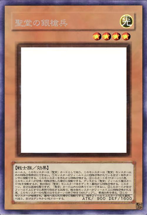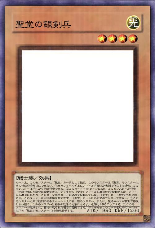 【戦士族/効果】 ルール上、このモンスターは「聖宵」カードとして扱う。このモンスターは「聖宵」モンスター以外の特殊召喚素材にできず、召喚・反転召喚・特殊召喚したターンの終了時にデッキの1番下に戻る。①相手モンスターの召喚・特殊召喚成功時、そのモンスターとこのモンスターの攻撃力の差が1000以上あるなら発動できる。手札からこのモンスターをその相手モンスターと同じ縦列の自分フィールド上に特殊召喚し、自分はデッキから1枚ドローする。このターン、自分は「聖宵」カード以外のカードの効果でデッキからカードを手札に加えることができない。②このモンスターは攻撃・相手のカードの効果の対象にならない。③このカード名で1ターンに1度、相手が攻撃力か守備力が3000以上のモンスターを召喚・特殊召喚した場合に発動できる。相手は自身のフィールド上から、攻撃力か守備力が3000以上のモンスター1体を選んで墓地へ送り、そのモンスターの攻撃力の半分の数値分ダメージを受ける。(これは戦闘ダメージとして扱う。) |