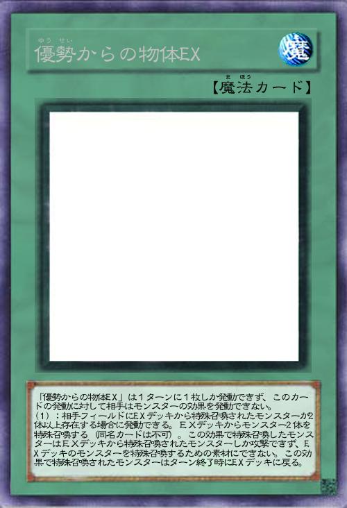 「優勢からの物体EX」は1ターンに1枚しか発動できず、このカードの発動に対して相手はモンスターの効果を発動できない。 (1):相手フィールドにEXデッキから特殊召喚されたモンスターが2体以上存在する場合に発動できる。EXデッキからモンスター2体を特殊召喚する(同名カードは不可)。この効果で特殊召喚したモンスターはEXデッキから特殊召喚されたモンスターしか攻撃できず、EXデッキのモンスターを特殊召喚するための素材にできない。この効果で特殊召喚されたモンスターはターン終了時にEXデッキに戻る。 |