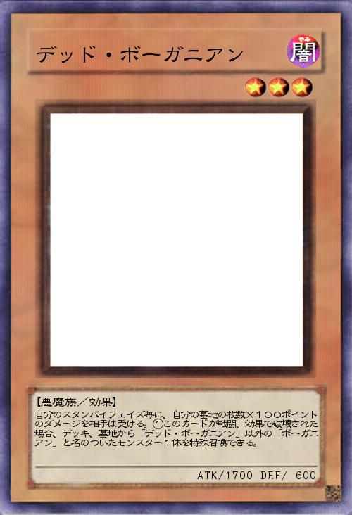 【悪魔族/効果】 自分のスタンバイフェイズ毎に、自分の墓地の枚数×100ポイントのダメージを相手は受ける。①このカードが戦闘、効果で破壊された場合、デッキ、墓地から「デッド・ボーガニアン」以外の「ボーガニアン」と名のついたモンスター1体を特殊召喚できる。 |