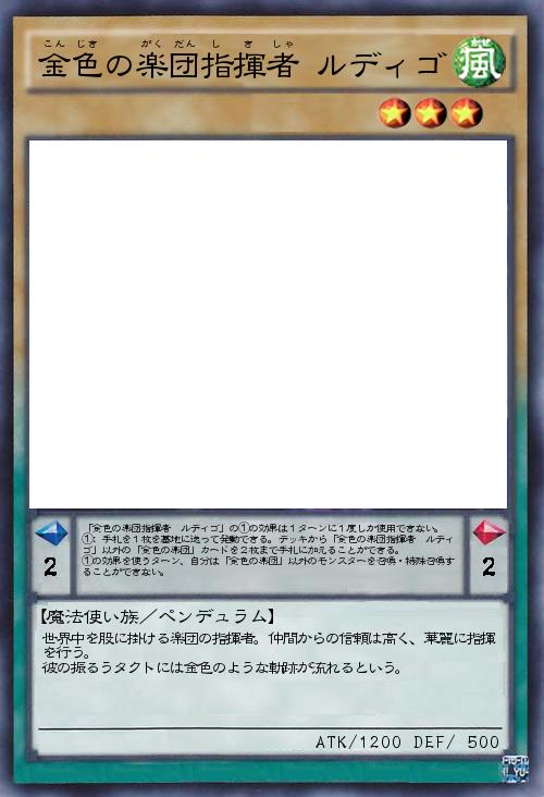 【魔法使い族/ペンデュラム】 世界中を股に掛ける楽団の指揮者。仲間からの信頼は高く、華麗に指揮を行う。 彼の振るうタクトには金色のような軌跡が流れるという。 「金色の楽団指揮者 ルディゴ」の①の効果は1ターンに1度しか使用できない。 ①:手札を1枚を墓地に送って発動できる。デッキから「金色の楽団指揮者 ルディゴ」以外の「金色の楽団」カードを2枚まで手札に加えることができる。 ①の効果を使うターン、自分は「金色の楽団」以外のモンスターを召喚・特殊召喚することができない。 |
