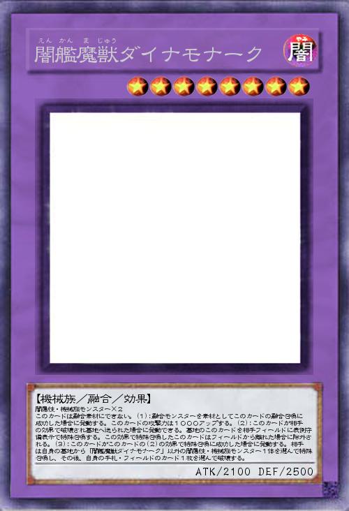 【機械族/融合/効果】 闇属性・機械族モンスター×2 このカードは融合素材にできない。(1):融合モンスターを素材としてこのカードの融合召喚に成功した場合に発動する。このカードの攻撃力は1000アップする。(2):このカードが相手の効果で破壊され墓地へ送られた場合に発動できる。墓地のこのカードを相手フィールドに表側守備表示で特殊召喚する。この効果で特殊召喚したこのカードはフィールドから離れた場合に除外される。(3):このカードがこのカードの(2)の効果で特殊召喚に成功した場合に発動する。相手は自身の墓地から「闇艦魔獣ダイナモナーク」以外の闇属性・機械族モンスター1体を選んで特殊召喚し、その後、自身の手札・フィールドのカード1枚を選んで破壊する。 |