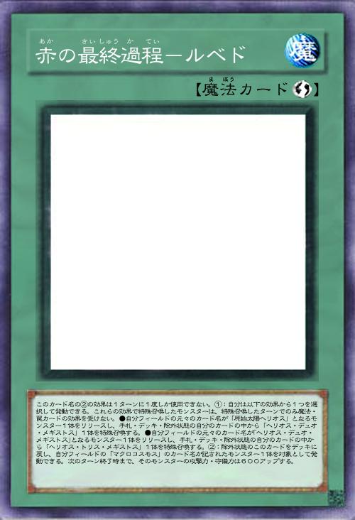 【炎族/特殊召喚/効果】 このカードは通常召喚できない。このカードの効果でのみ特殊召喚できる。①:除外状態の自分のカードの中に「ヘリオス・デュオ・メギストス」が存在し、手札の「赤の最終過程-ルべド」1枚と元々のカード名が「ヘリオス・トリス・メギストス」となる自分フィールドのモンスター1体を除外して発動できる。このカードを手札から特殊召喚する。②:このカードの攻撃力と守備力は、自分の除外状態のカードの数×400になる。③:このカードが特殊召喚に成功した場合、レベルを1つ宣言して発動できる。このカードがモンスターゾーンに存在する限り、お互いにLモンスター及び宣言したレベルのモンスターを特殊召喚できない。④:1ターンに1度、発動できる。自分フィールドのアドバンス召喚したモンスター及び手札から特殊召喚した通常召喚できないモンスターの数までフィールド・墓地の魔法・罠カードを選んで除外できる。 |