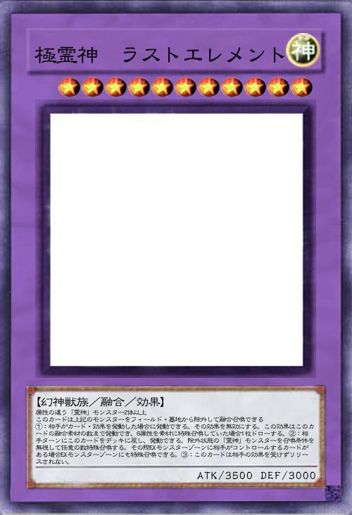 【幻神獣族/融合/効果】 属性の違う「霊神」モンスター2体以上 このカードは上記のモンスターをフィールド・墓地から除外して融合召喚できる ①:相手がカード・効果を発動した場合に発動できる。その効果を無効にする。この効果はこのカードの融合素材の数まで発動でき、6属性を素材に特殊召喚していた場合1枚ドローする。②:相手ターンにこのカードをデッキに戻し、発動できる。除外状態の「霊神」モンスターを召喚条件を無視して任意の数特殊召喚する。その際EXモンスターゾーンに相手がコントロールするカードがある場合EXモンスターゾーンにも特殊召喚できる。③:このカードは相手の効果を受けずリリースされない。 |