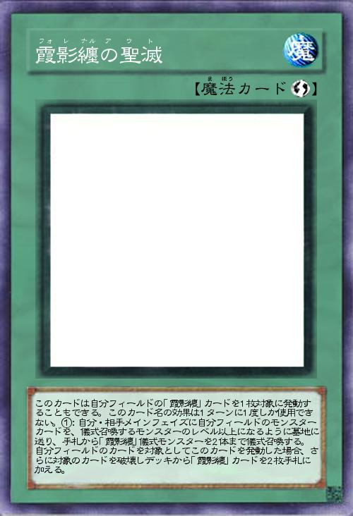 このカードは自分フィールドの「霞影纏」カードを1枚対象に発動することもできる。このカード名の効果は1ターンに1度しか使用できない。①:自分・相手メインフェイズに自分フィールドのモンスターカードを、儀式召喚するモンスターのレベル以上になるように墓地に送り、手札から「霞影纏」儀式モンスターを2体まで儀式召喚する。自分フィールドのカードを対象としてこのカードを発動した場合、さらに対象のカードを破壊しデッキから「霞影纏」カードを2枚手札に加える。 |
