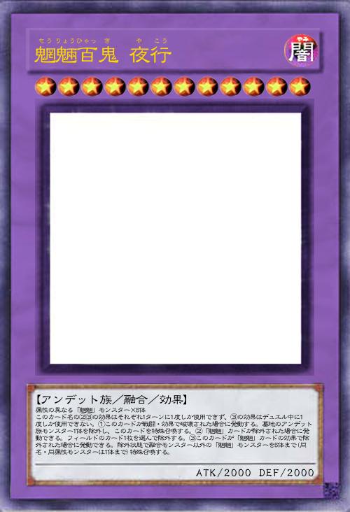 【アンデット族/融合/効果】 属性の異なる「魍魎」モンスター×5体 このカード名の②③の効果はそれぞれ1ターンに1度しか使用できず、③の効果はデュエル中に1度しか使用できない。①このカードが戦闘・効果で破壊された場合に発動する。墓地のアンデット族モンスター1体を除外し、このカードを特殊召喚する。②「魍魎」カードが除外された場合に発動できる。フィールドのカード1枚を選んで除外する。③このカードが「魍魎」カードの効果で除外された場合に発動できる。除外状態で融合モンスター以外の「魍魎」モンスターを5体まで(同名・同属性モンスターは1体まで)特殊召喚する。 |
