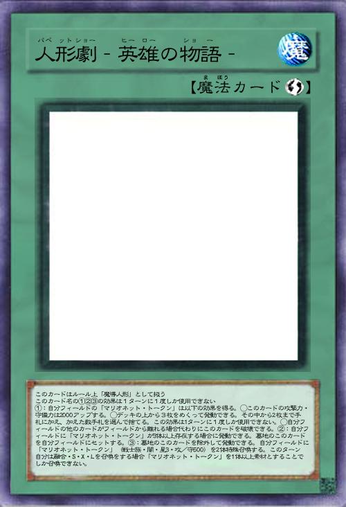 このカードはルール上「魔導人形」として扱う このカード名の①②③の効果は1ターンに1度しか使用できない ①:自分フィールドの「マリオネット・トークン」は以下の効果を得る。◯このカードの元々の攻撃力は2000になる。◯手札を1枚捨てて発動できる。デッキからテキストに「マリオネット・トークン」を含むカードを1枚手札に加える。この効果は1ターンに1度しか使用できない。②:自分フィールドに「マリオネット・トークン」が3体以上存在する場合に発動できる。墓地のこのカードを自分フィールドにセットする。③:墓地のこのカードを除外して発動できる。自分フィールドに「マリオネット・トークン」(戦士族・闇・星3・攻/守500)を2体特殊召喚する。このターン自分は融合・S・X・Lを召喚をする場合「マリオネット・トークン」を1体以上素材とすることでしか召喚できない。 |