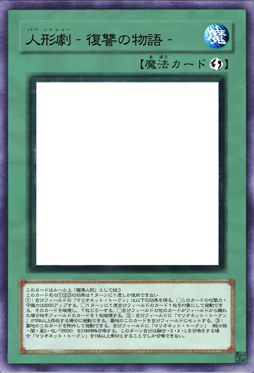 このカードはルール上「魔導人形」として扱う このカード名の①②③の効果は1ターンに1度しか使用できない ①:自分フィールドの「マリオネット・トークン」は以下の効果を得る。◯このカードの攻撃力・守備力は2000アップする。◯1ターンに1度自分フィールドのカード1枚を対象にして発動できる。そのカードを破壊し、1枚ドローする。◯自分フィールドの他のカードがフィールドから離れた場合相手フィールドのカードを1枚破壊する。②:自分フィールドに「マリオネット・トークン」が3体以上存在する場合に発動できる。墓地のこのカードを自分フィールドにセットする。③:墓地のこのカードを除外して発動できる。自分フィールドに「マリオネット・トークン」(戦士族・闇・星3・攻/守500)を2体特殊召喚する。このターン自分は融合・S・X・Lを召喚をする場合「マリオネット・トークン」を1体以上素材とすることでしか召喚できない。 |