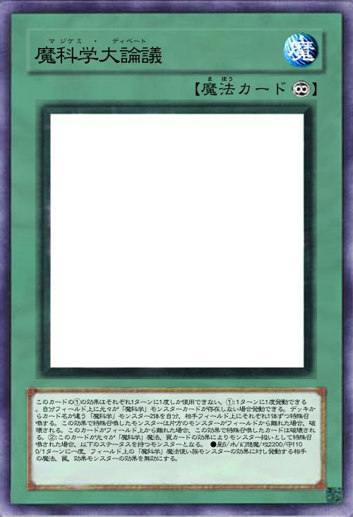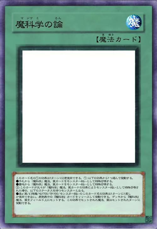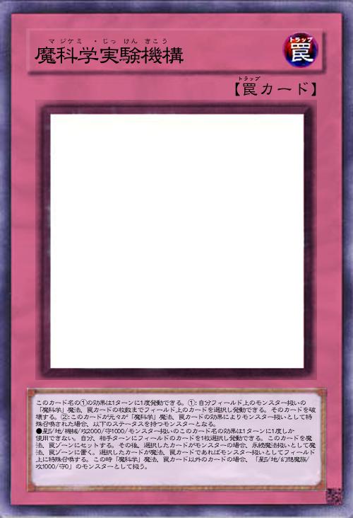 このカード名の①の効果は1ターンに1度しか使用できない。このカード名のカードは1枚しかフィールド上表側表示で存在できない。①:お互いのメインフェイズ時に発動できる。デッキから「魔科学の素粒子発生装置」「魔科学」魔法、罠カード1枚をモンスター扱いとして特殊召喚する。この効果を発動したターン、自分は「魔科学」モンスターしかEXデッキから特殊召喚できない。②:このカードが元々が「魔科学」魔法、罠カードの効果によりモンスター扱いとして特殊召喚された場合、以下のステータスを持つモンスターとなる。 ●星4/地/機械/攻1000/守2000/モンスター扱いのこのカード名の効果は1ターンに1度しか使用できない。自分フィールド上のこのカード以外のモンスター扱いの「魔科学」魔法、罠カード1枚を選択し発動できる。手札から「魔科学」魔法、罠カードを1枚モンスター扱いとして特殊召喚し、選択したカードを手札に戻す。その後、このカードを魔法、罠ゾーンにセットする。 |