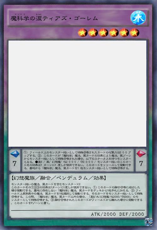 【幻想魔族/融合/効果】 「魔科学」融合モンスター+モンスター扱いの魔法、罠カード×2 このカードは融合召喚でのみ特殊召喚できる。このカードが「魔科学」魔法カードで融合召喚する場合、相手フィールド上のモンスター扱いの魔法、罠カードもその素材とできる。このカード名の②③の効果は1ターンに1度しか使用できない。①:このカードは、相手のカード効果では破壊できない。②:魔法、罠、効果モンスターの効果を発動した時にフィールド上モンスター扱いの魔法、罠カード1枚を元々の持ち主の正しいゾーンにセットして発動できる。その効果を無効にし破壊する。③:このカードが相手によりフィールド上から離れた場合発動できる。EXデッキ、墓地から「魔科学の結晶マジリアル・ゴーレム」以外の「魔科学」モンスターを1体特殊召喚する。 |