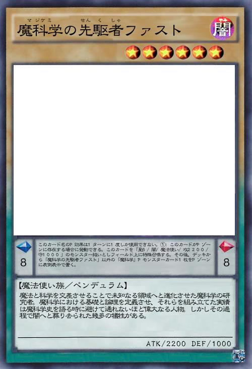 ①:1ターンに1度、フィールド上に存在しない墓地の「魔科学」カード1枚を除外して発動できる。除外したカードと同じ名称のカードをデッキから1枚手札に加えるか、モンスター扱いとして特殊召喚できる。②:このカードが元々が「魔科学」魔法、罠カードの効果によりモンスター扱いとして特殊召喚された場合、以下のステータスを持つモンスターとなる。 ●星4/地/幻想魔/攻1700/守700/モンスター扱いのこのカード名の効果は1ターンに1度しか使用できない。墓地の「魔科学」魔法、罠カードを1枚選択し発動できる。そのカードをデッキに戻し、除外されている「魔科学」魔法、罠カードを手札に加えるか、モンスター扱いとして特殊召喚できる。 |