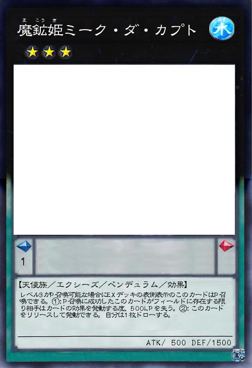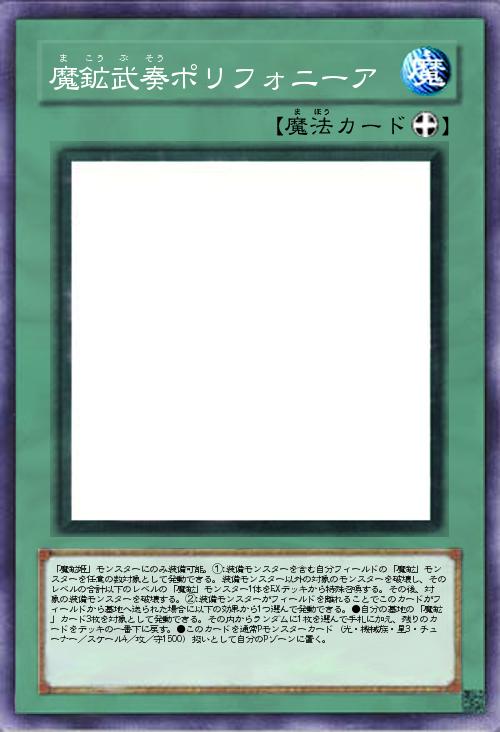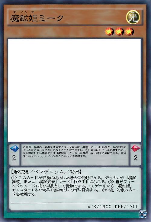 このカードの発動後、ターン終了時まで自分は「魔鉱舞装」罠カードを発動できない。自分の墓地に「魔鉱」カード以外の魔法・罠カードが存在しない場合、このカードはセットしたターンでも発動できる。①:以下の効果から1つ選択して発動できる。●自分EXデッキの表側表示のカード1枚を墓地へ送って発動できる。元々の種類(魔法・罠・モンスター)と異なる種類の自分フィールドのカードの数までフィールドのカードを選んで破壊する。●自分の墓地の「魔鉱」Pモンスター1体をEXデッキに表側表示で加えて発動できる。このカードを通常Pモンスターカード(光・天使族・星6・スケール9・攻/守1600)扱いとして自分Pゾーンに置く。 |