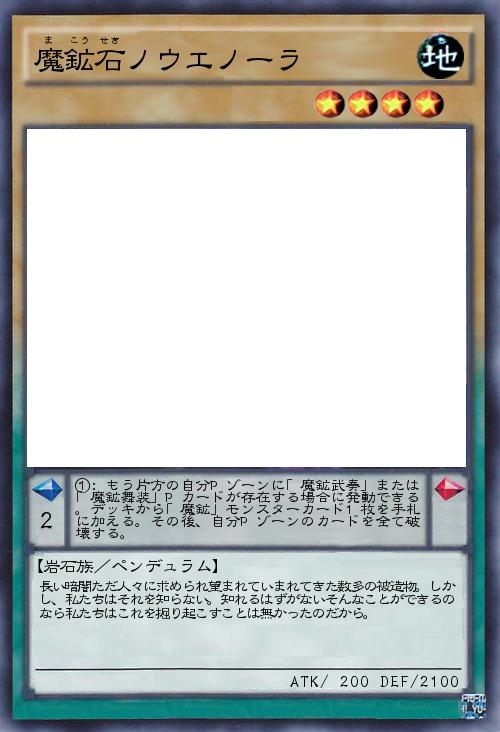 【岩石族/ペンデュラム/効果】 ①:このカードが召喚に成功した場合に発動できる。デッキから「魔鉱舞装」または「魔鉱武奏」カード1枚を手札に加える。②:自分フィールドのカード1枚を対象として発動できる。EXデッキから「魔鉱姫」モンスター1体を効果を無効化して特殊召喚する。その後、対象のカードを破壊する。 このカード名のP効果を使用するターン自分は「魔鉱」カード以外のカードの効果でデッキからカードを手札に加えることができない。①:自分EXデッキに表側のカードが存在しない場合または「魔鉱姫」カードしか存在しない場合に発動できる。自分は2枚ドローし、Pゾーンのこのカードを破壊する。 |
