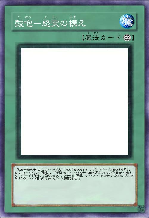 「鼓咆-怒突の構え」はフィールド上に1枚しか存在できない。①:このカードが存在する限り、自分フィールド上の「軍姫」、「将姫」モンスターは相手に直接攻撃ができる。②:墓地に存在するこのカードを除外して発動できる。デッキから「軍姫」モンスター1体を手札に加える。②の効果はこのカードが墓地に送られたターン使用できない。 |