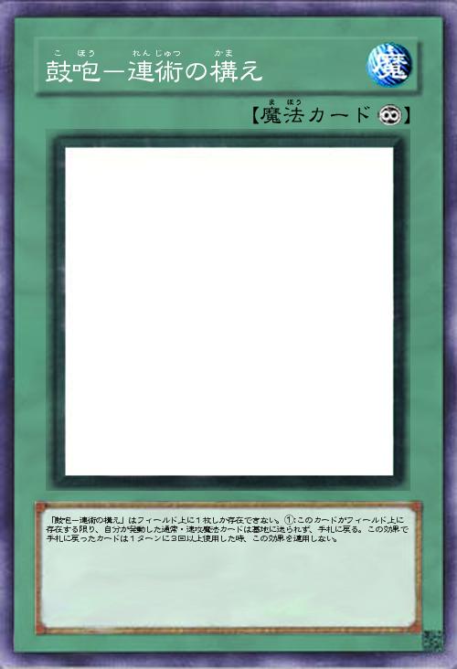 「鼓咆-連術の構え」はフィールド上に1枚しか存在できない。①:このカードがフィールド上に存在する限り、自分が発動した通常・速攻魔法カードは墓地に送られず、手札に戻る。この効果で手札に戻ったカードは1ターンに3回以上使用した時、この効果を適用しない。 |
