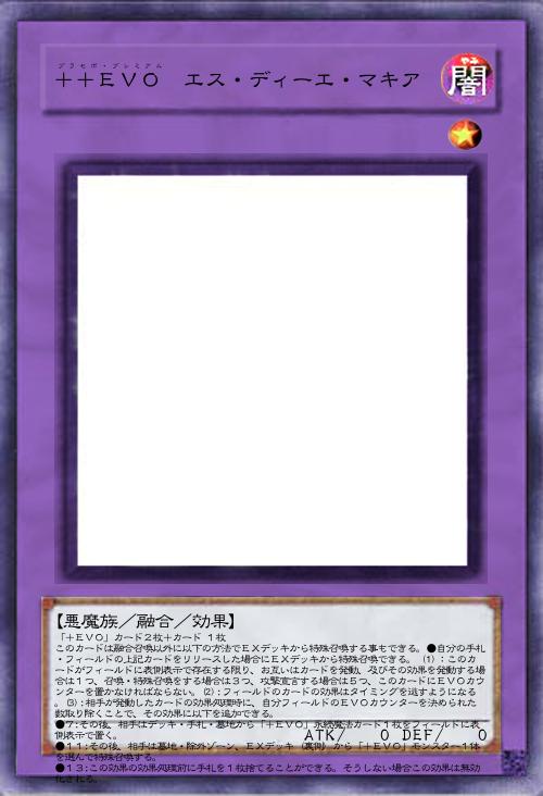 【悪魔族/融合/効果】 「+EVO」カード×2 このカードは融合召喚以外に以下の方法でEXデッキから特殊召喚する事もできる。●自分の手札・フィールドの上記カードをリリースした場合にEXデッキから特殊召喚できる。 (1):このカードがフィールドに表側表示で存在する限り、お互いはカードを発動、及びその効果を発動する場合は1つ、召喚・特殊召喚をする場合は3つ、攻撃宣言する場合は5つ、このカードにEVOカウンターを置かなければならない。(2):このカードがフィールドに存在する限り、お互いの手札枚数制限は0枚になり、お互いが手札枚数制限によって永続魔法カードを墓地に送る場合、代わりにその永続魔法カードと同じ効果を持ったモンスター(悪魔族/星1/攻/守0)として自分のフィールドに特殊召喚できる。(3):このカードがフィールドに存在する限り、自分フィールドの「+EVO」モンスターの戦闘で発生する自分へのダメージは0になり、戦闘を行うモンスターにEVOカウンターが乗っている場合、それらは戦闘では破壊されない。 |